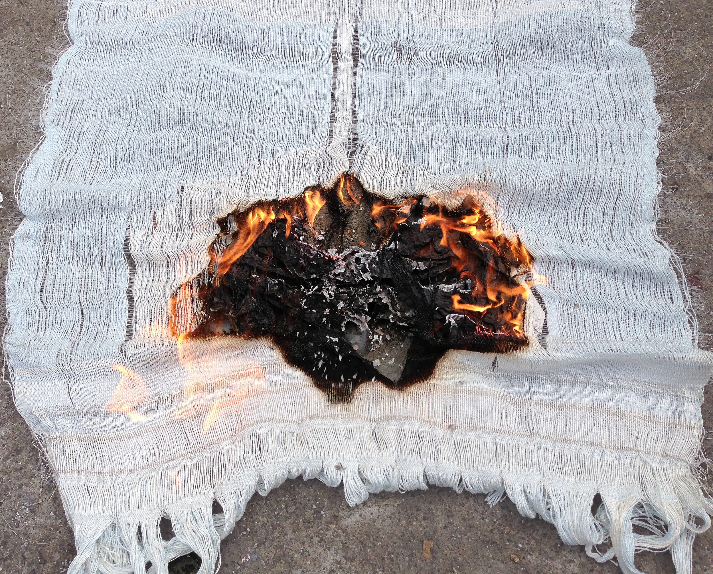 The creation and burning of this piece is the artist’s gesture; a making of personal ritual specifically in honor of passing of a family member.
